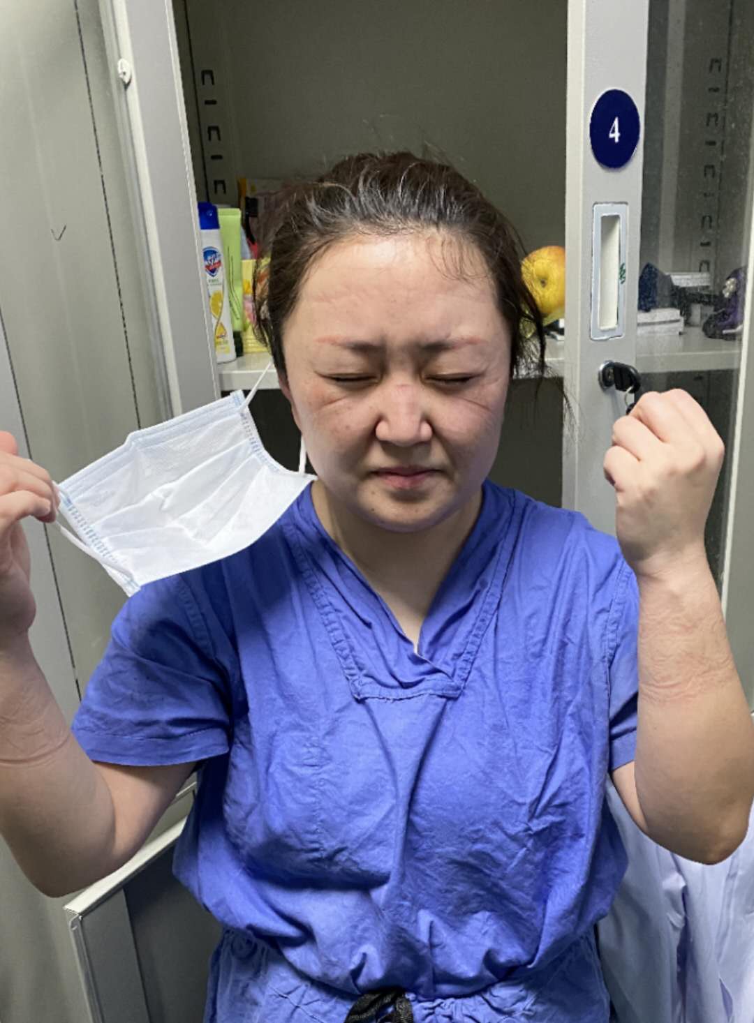 防护服、N95口罩、护目镜、面屏,全副武装,外面密不透风,里面是满满的水汽。口罩帽子勒得耳朵疼,护目镜压得鼻梁和脸疼,兄弟姐妹对这些早已习惯,对病房环境的恐惧也逐渐消弭。面对患者,我们准确无误完成操作,快而不乱,紧张而有序。面对这样的我们,患者的心情也逐渐放松,坚定着战胜疾病的信心。