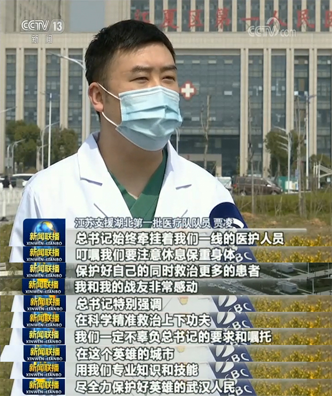 坚守的还有来自各地的医疗队,贾凌是江苏第一批支援湖北医疗队队员,他和140位同事在大年初一就到达武汉江夏区第一人民医院。来自重症医学科的他,目前已成功实施插管十多例。总书记说,一线的医务工作者最辛苦,是新时代最可爱的人,这让贾凌和广大一线医务工作者倍感温暖,充满力量。