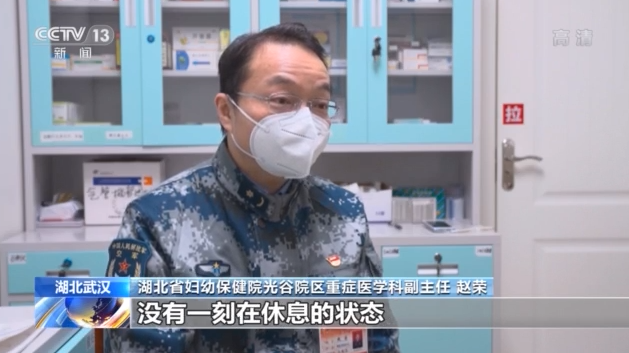 湖北省妇幼保健院光谷院区重症医学科副主任 赵荣:他随时都有可能处在一种抢救状态,一个班4个医生6个护士,甚至要6个护士进红区,大家从进来到出去没有一刻在休息。