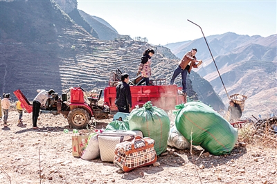 会泽县易地扶贫搬迁的乡亲们在运送行李。
