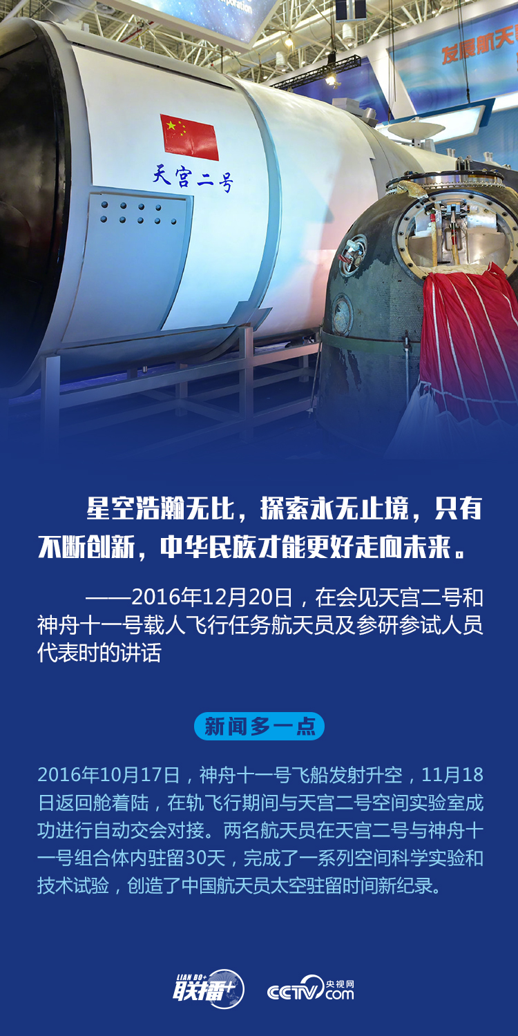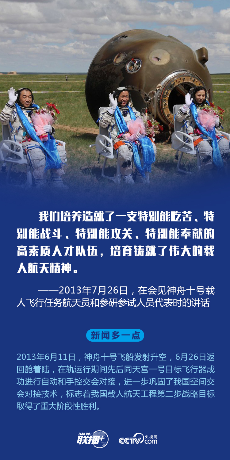习近平总书记十分重视中国航天事业发展,多次全流程关注神舟十号、神舟十一号等重大航天工程任务进展,就中国航天事业发展强调:“取得这样的成就,最根本的一点,就是中国航天事业始终坚持自力更生、自主创新。中国是一个大国,必须成为科技创新大国。”