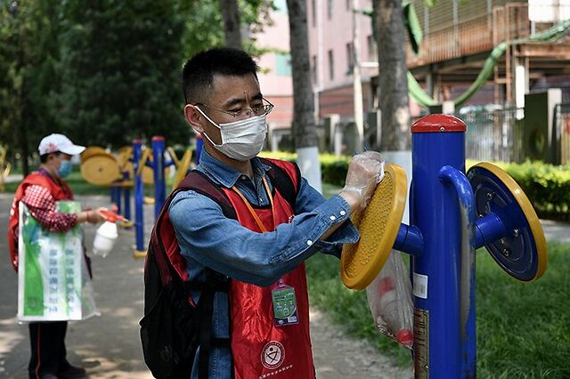志愿者正在给园中健身器材进行清洁消毒。