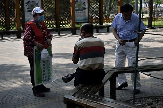 莲花池公园里,沙坑游乐场,家长陪着孩子聚集了十几人,志愿者上前提醒,要保持安全距离并戴好口罩。湖边树荫下,游人摆餐布野餐、走进月季丛中拍照,被志愿者及时劝离。志愿者们还自带着消毒液、抹布、镊子、塑料袋等工具,一边清洁园内垃圾桶、长廊座椅、健身器材,一边捡起丢弃在各处的垃圾。