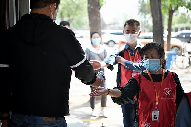 志愿者经过测温后,进入莲花池公园。