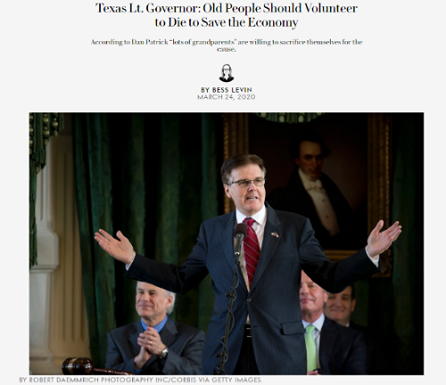 △美国《名利场》网站3月24日报道美国得克萨斯州副州长帕特里克声称愿意牺牲自己和其他老人以换取美国经济重启