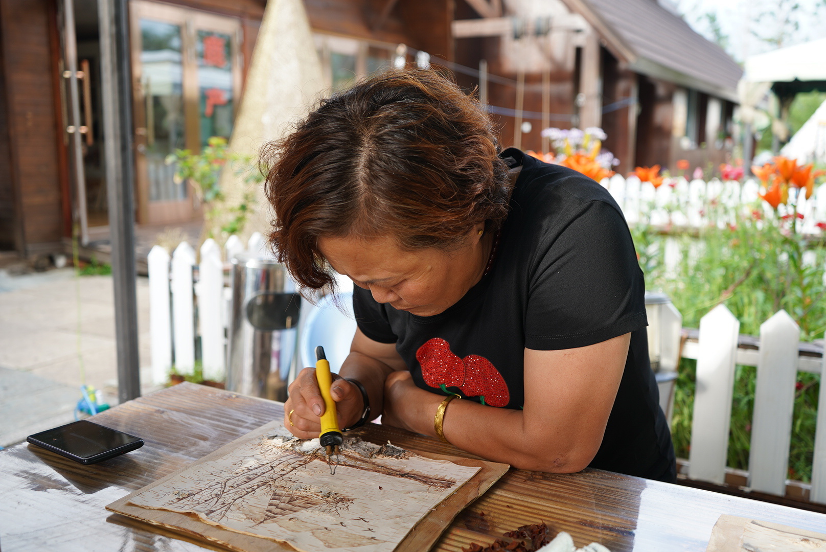 走进她家,满墙的桦树皮画精美传神,再现鄂温克族人与驯鹿的生活场景,让人难以相信这些都是出自从未学过画画的张国凤之手。这些桦树皮画不仅能售卖,还将整间民宿装饰得“熠熠生辉”,张国凤也自豪地说:“我家应该是敖乡最漂亮的了!”