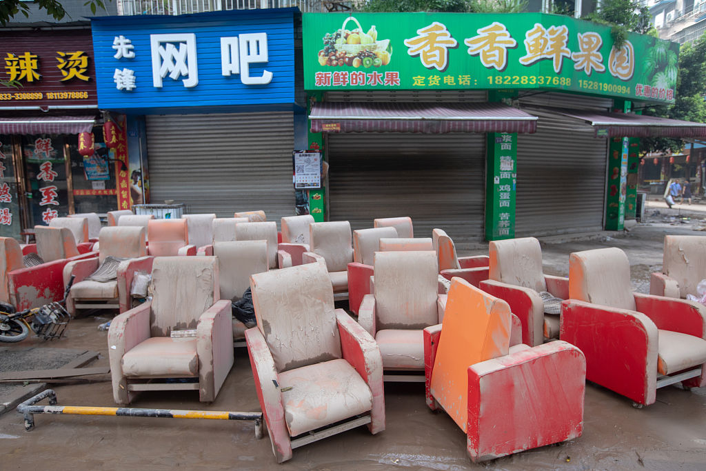 2020年8月20日,四川乐山,五通桥区竹根镇中心路,洪水退去,市民进行灾后自救。