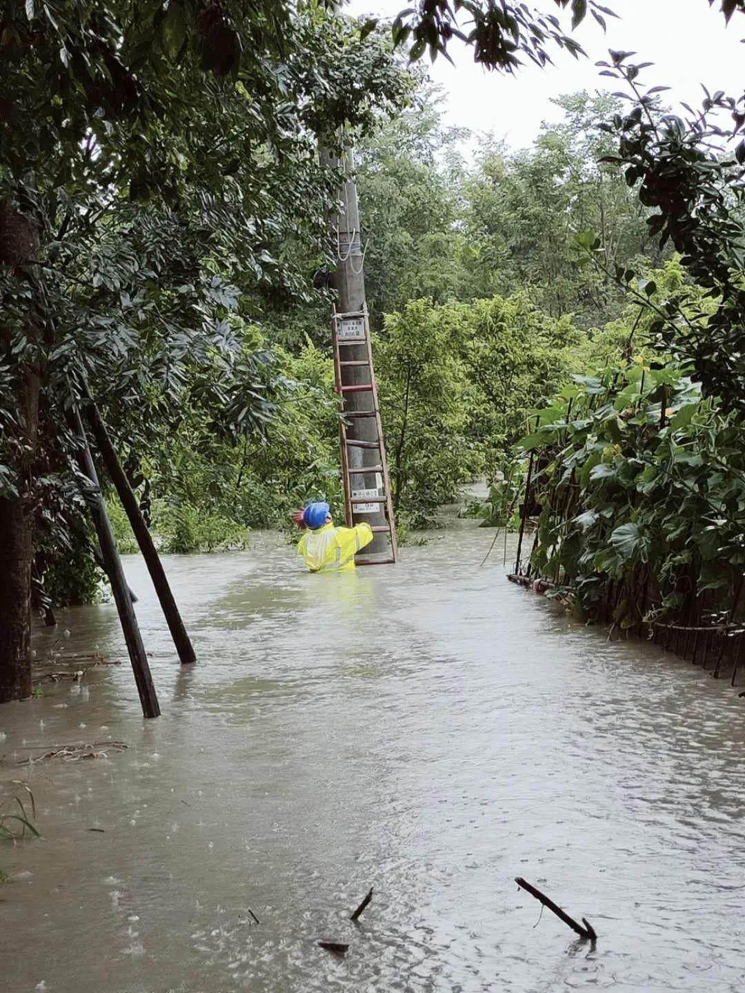 ▲8月16日,成都郫都区内涝灾情严重,国网四川电力共产党员服务队队员淌过齐腰的河水进行作业操作