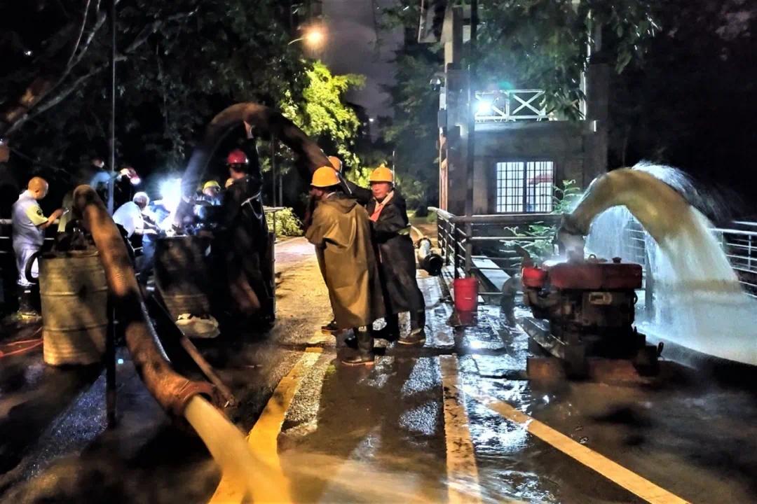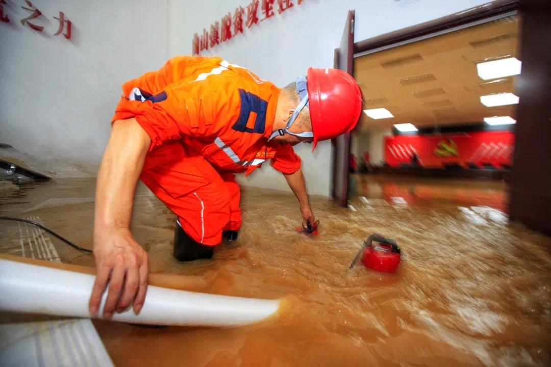 ▲国网绵阳供电公司员工在北川县曲山镇政府附近用潜水泵排除内涝积水,同时恢复被水淹小区正常供电