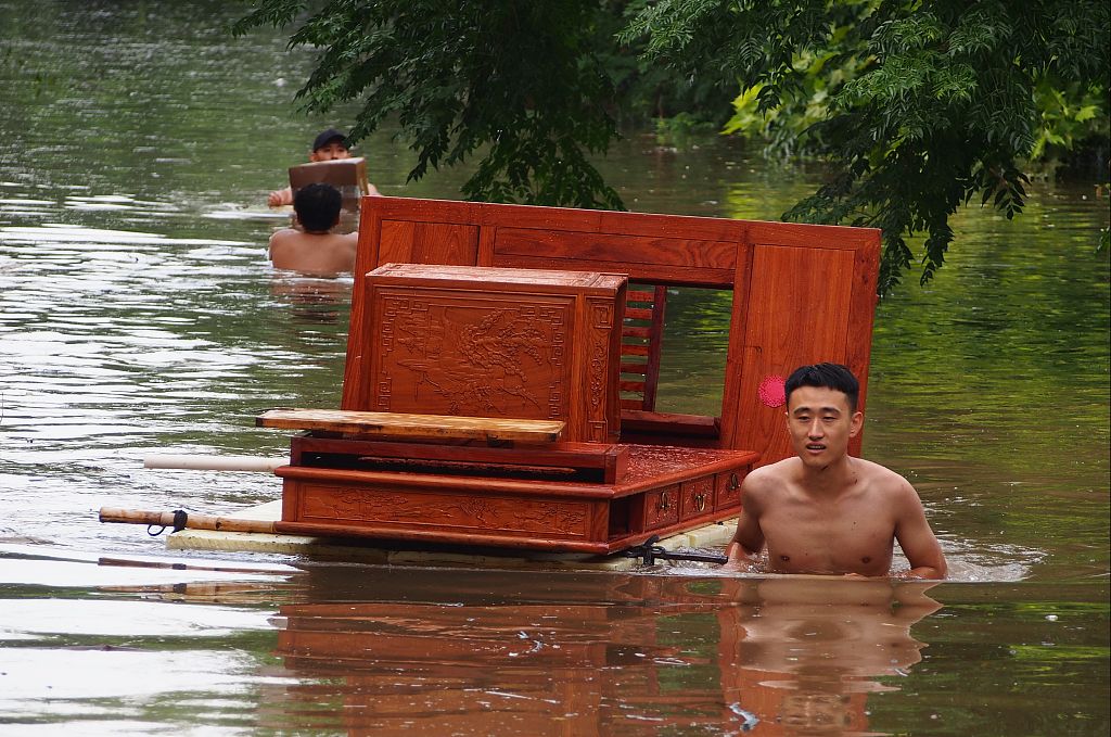 2020年8月27日,青岛,台风“巴威”过境带来狂风暴雨,在即墨区蓝村街道王家辛庄,村民们从没过膝盖的积水中打捞家具。