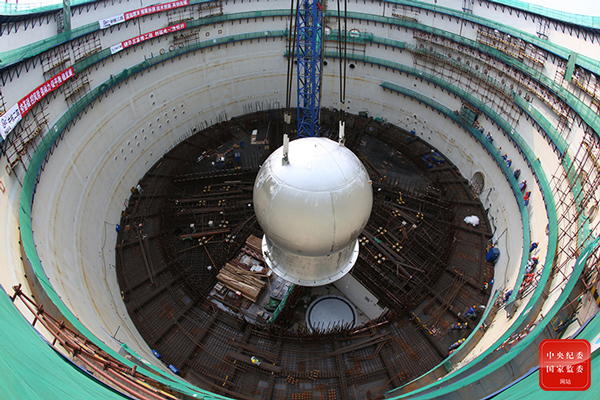 2016年4月22日,“华龙一号”首堆福清核电5号机组核岛三台安注箱吊装完成。(中核集团 供图)