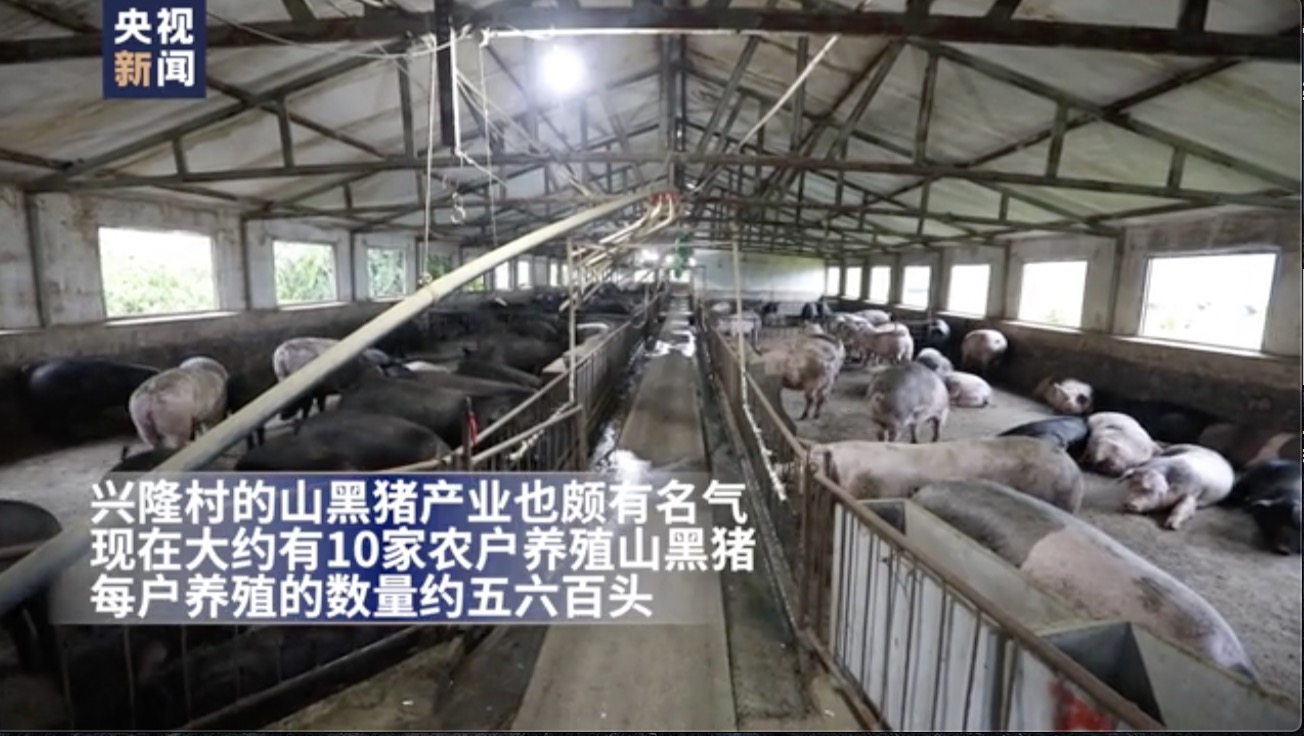 兴隆村的山黑猪产业也颇有名气,现在大约有10家农户养殖山黑猪,每户养殖的数量约五六百头。兴隆村的山林环境好,山里盛产多种名贵中草药,山黑猪在这种生态环境中可采食多种中草药和植物的根茎、果实。这里山多坡缓、水源充足、植被茂盛,是饲养有机山黑猪的理想之地。他们的山黑猪采用当地黑猪作母本,引进大白猪、杜洛克和汉普夏等猪种,经过八年的杂交选育而成的。和普通白猪比,山黑猪口感好,肉质嫩,营养价值高。几年前,兴隆村的山黑猪产品就打进了北京、天津市场。
