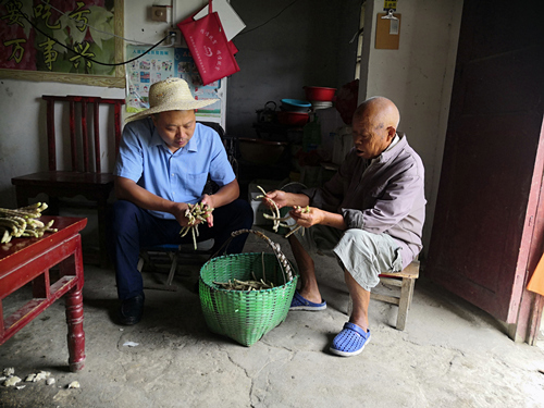 杨坤山在贫困户家帮忙整理豆角。三星村供图