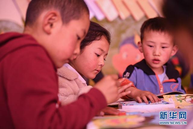 青海省果洛藏族自治州玛沁县拉加镇中心幼儿园正在上课的孩子们。(新华网潘彬彬 摄)