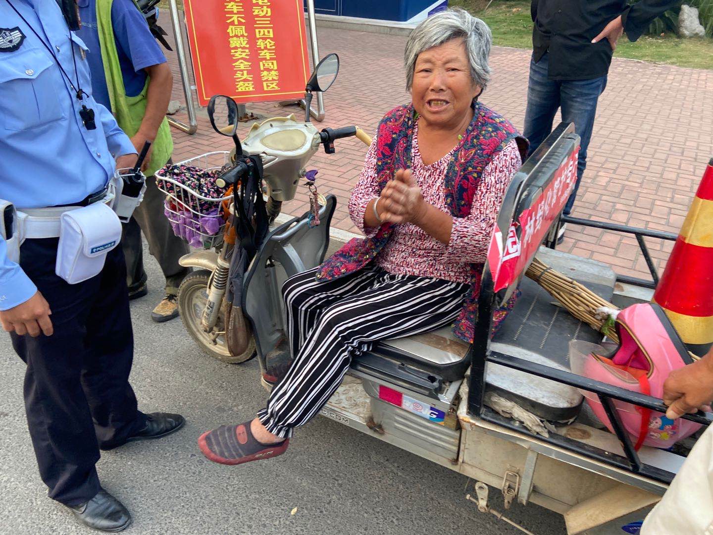 考虑到这个情况,民警陈港让文伟杰在该路口边执勤边等待失主,他和邬帅则回到中队调取路口监控,查找失主。经过一个多小时搜索,他们最终确定失主是一名开电动三轮车的人,在三轮车上发现园林绿化管护专用车以及在三轮车整治办喷涂的放大号等字样。