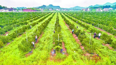 四川省仪陇县潮水坝村村民在柑橘产业园梳果。