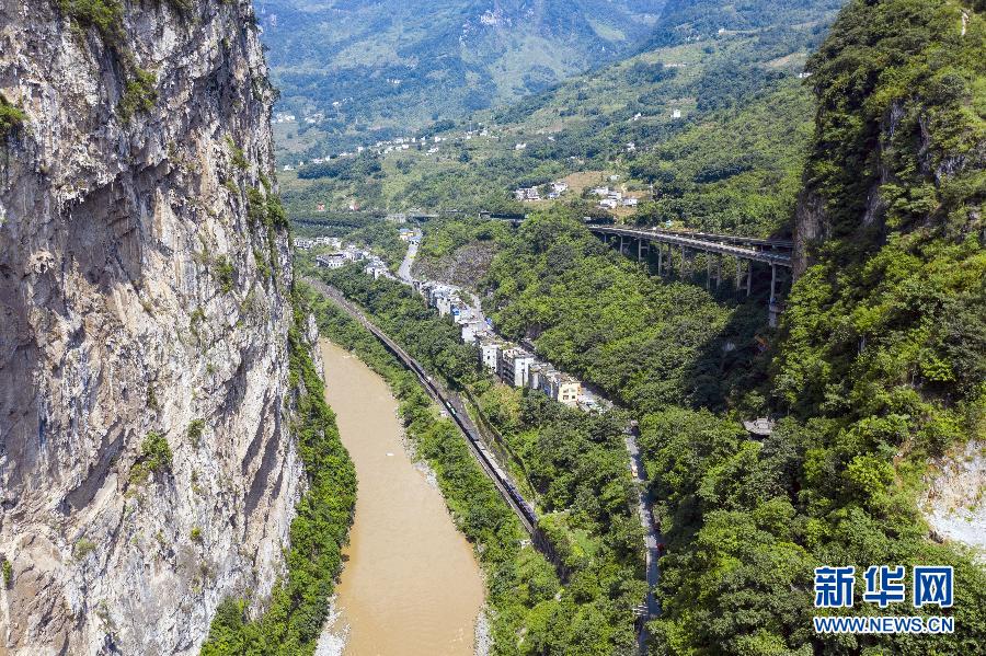 在云南省昭通市盐津县豆沙关,五尺道、关河水道、内昆铁路、G247公路及G85渝昆高速5条不同时期的交通线路以几乎并行的姿态呈现眼前(8月10日摄,无人机照片)。 新华社记者 江文耀 摄