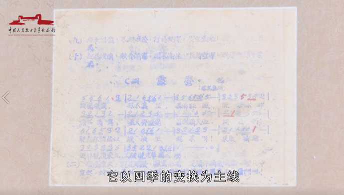 展柜中泛黄的歌谱,是《露营之歌》的手稿,歌曲创作于1938年,以四季的变换为主线,真实记录了抗联战士们“火烤胸前暖,风吹背后寒”的战斗生活,表达了将士们忠于祖国、抗击日本侵略者的坚定信念。
