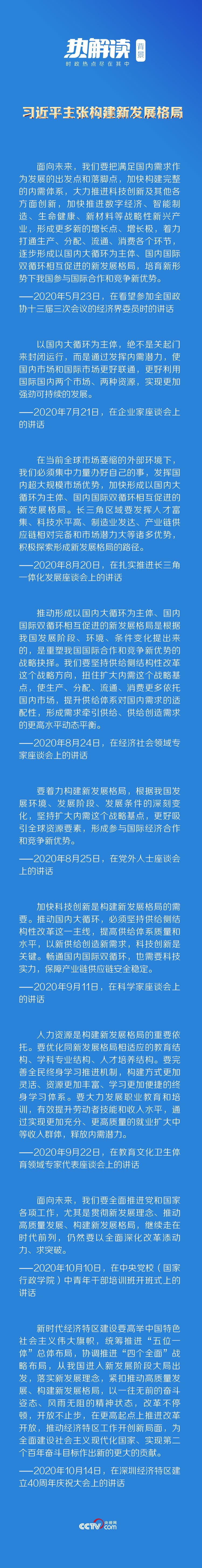 着眼我国发展阶段、环境、条件变化,习近平总书记提出,要推动形成以国内大循环为主体、国内国际双循环相互促进的新发展格局。在今年的一系列重要讲话中,总书记也从不同角度对新发展格局作出深刻阐释。