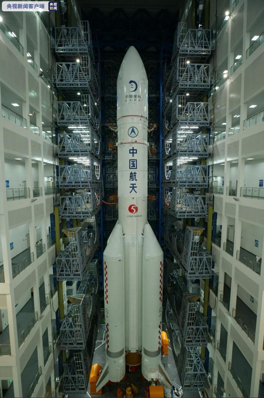 11月17日,长征五号遥五运载火箭和嫦娥五号探测器在中国文昌航天发射场完成技术区总装测试工作后,垂直转运至发射区,计划于11月下旬择机实施发射。