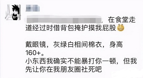 学姐认定用手猥亵其臀部,强行查看其学生卡后公开其姓名等信息,在朋友圈等平台诬陷其性骚扰,该消息大肆传播。
