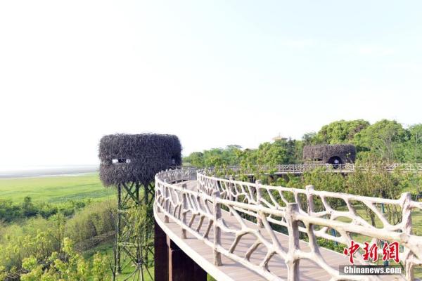 候鸟小镇的观鸟台设计采用仿生学原理,建造了鸟巢、鸟蛋、梧桐树等造型观鸟点。建筑材料就地取材,利用旧砖、旧瓦等,减少环境破坏与污染。图为永修县吴城镇候鸟小镇观鸟点。 江西九江永修县委宣传部供图