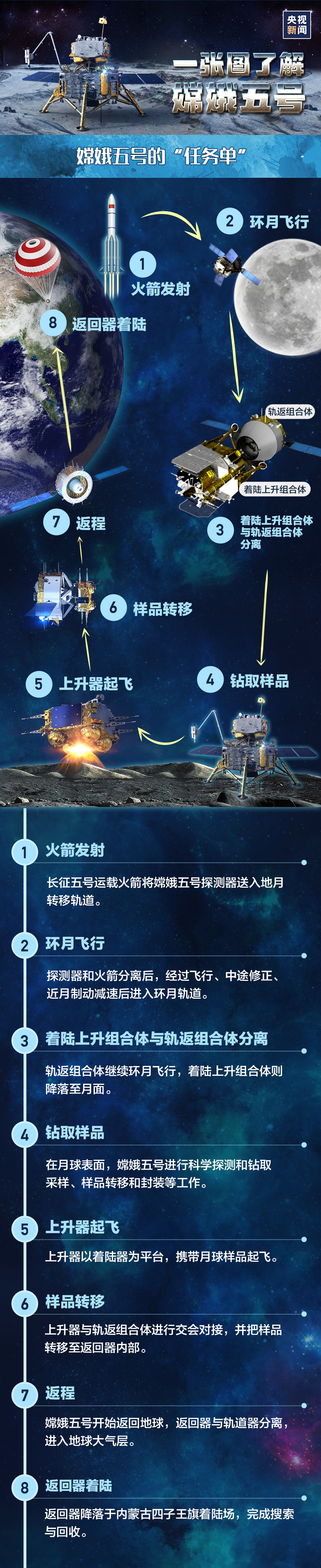 嫦娥五号从发射到落月需要经历怎样的过程?这一次,“嫦娥”将在月球上做些什么,又将如何从月球返回?跟随央视新闻的这张长图,一起揭秘↓↓↓