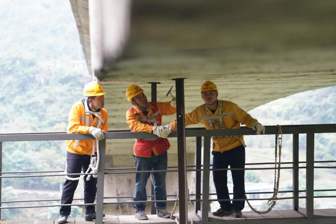 “工作第3年了,我最打怵的还是给栏杆除锈,往下看令人头晕目眩。峡谷的风从四面八方吹来,常常吹得人满脸铁锈。”张宝的徒弟彭仪说。他将安全绳扣在栏杆上,左手紧紧抓着托架,右手拿着打磨机进行打磨。空气中弥漫着厚重的铁锈味,汗水顺着彭仪的额头流下。