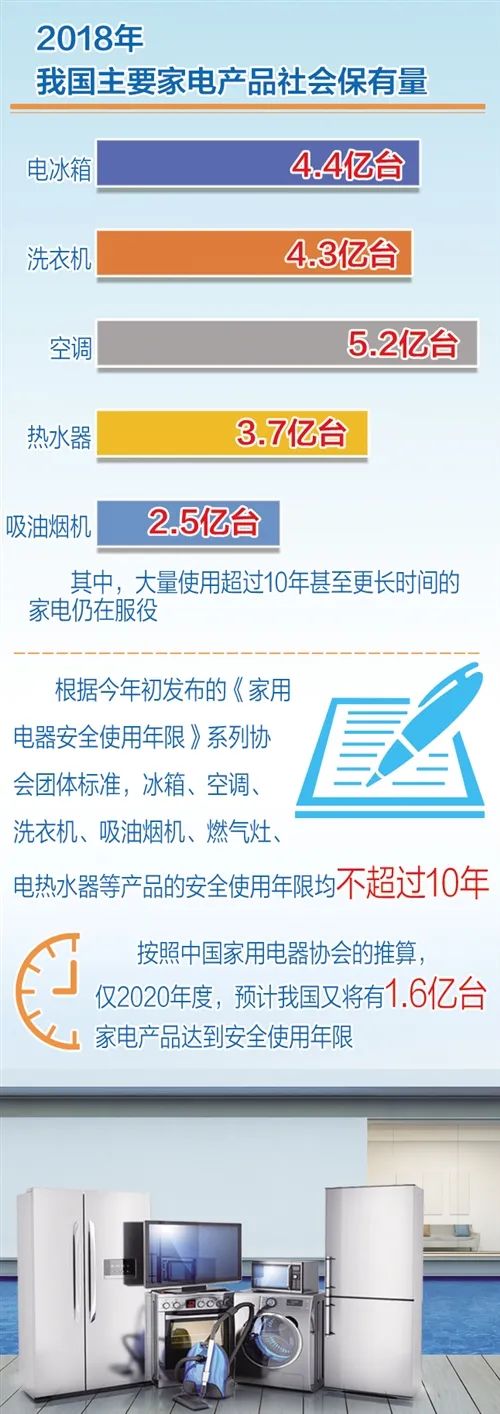 数据显示,2018年,我国主要家电产品社会保有量分别是:电冰箱4.4亿台、洗衣机4.3亿台、空调5.2亿台、热水器3.7亿台、吸油烟机2.5亿台。其中,大量使用超过10年甚至更长时间的家电仍在服役。