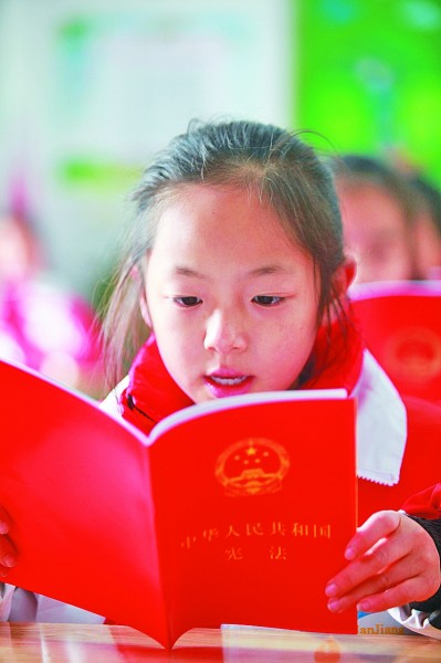 12月3日,江苏省扬州市邗江实验学校新盛分校的学生在诵读宪法。在第七个“国家宪法日”来临之际,各地学校开展宪法知识宣传活动,通过宪法诵读、宪法知识小课堂等形式,对学生进行宪法教育。新华社发