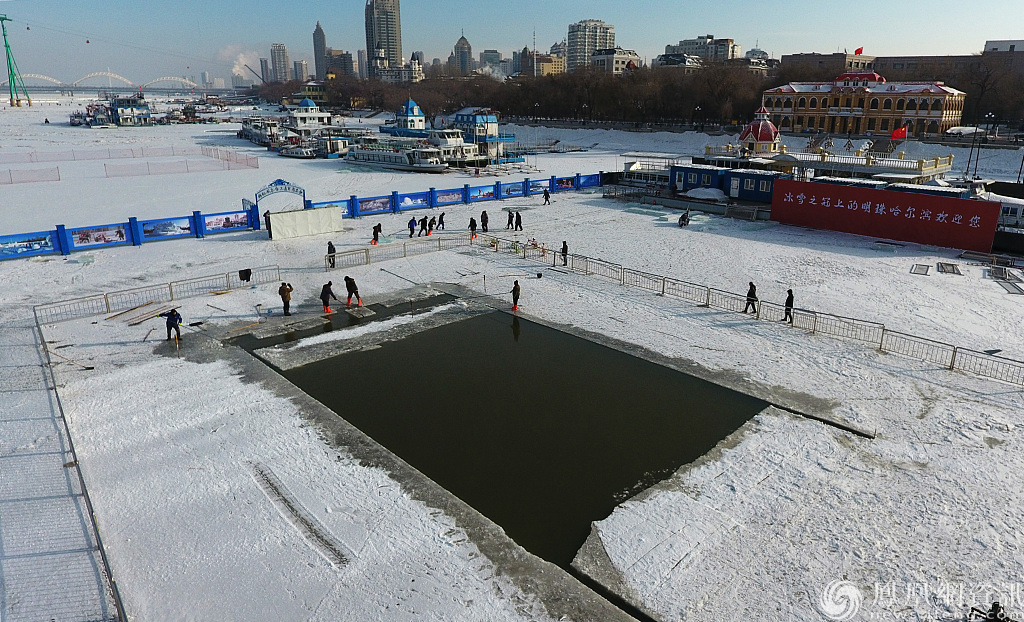 2020年12月24日,位于哈尔滨市道里区九站公园江畔的市总工会码头,市总工会几十名工作人员一起开冬泳池,在距离江边百余米的江面上,开了长25米、宽12米的拥有4条泳道的冬泳池,建成哈尔滨市总工会冬泳浴场。这次依然采用传统的方式,工作人员排成一行,利用冰钎子一起凿冰,就是所谓振冰,形成裂缝,进一步“裁剪”成长条冰块,可以利用的就振成小块拉上岸,有的长条直接靠多人拉拽压入江水中,靠水流冲走。最后安装上电动机和螺旋桨在冬泳运动员不用冬泳池的时候搅动水面以防结冰,一上午时间就全部建成冬泳池。