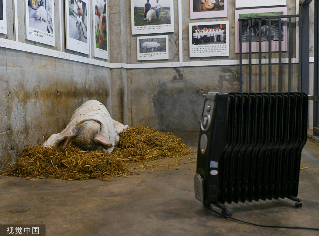 2021年1月11日,近日寒潮持续,成都最低气温跌破0℃,汶川地震“猪坚强”的现状引起网友关注和讨论,笔者走进成都建川博物馆探访“猪坚强”。上午10点,“猪坚强”躺在“别墅”内睡意正浓,只见它卧在稻草上,盖着棉被,一旁还备有供暖设备。(来源:视觉中国)