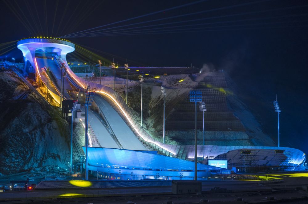 这是位于河北省张家口市崇礼区的国家跳台滑雪中心“雪如意”点亮效果(无人机照片,2020年12月19日摄)。新华社发