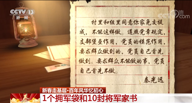 在其中的一封家书里,秦光远写了这样一段话:村里和组里同意你家免交提成,不能这样做。遵照党章规定,支部堡垒作用,党员的模范作用,要求群众做到的,党员自己首先做到。要求群众不能做的事,党员自己首先不做。