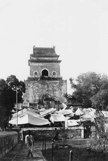 钟鼓楼是中轴线最北端的标志性建筑,它如同紫禁城身后两座巍峨的守护神。其始建于元代,按“前朝后市”之说,当时这里有帽子市、皮货市、鹅鸭市、珠子市、柴炭市、铁器市、米市、面市等。钟鼓楼前的市场曾被老北京称为“北城乐园”。明初因战乱,这里的商业一度萧条,后来随着城市报时的“暮鼓晨钟”之声,商业有所恢复。清代,一些达官贵人选中什刹海岸营建府邸,鼓楼地区更加繁荣起来,鼓楼前及烟袋斜街陆续出现了酒楼、饭庄、茶馆、钱庄等。民初,钟楼之下开设了电影院,加上街道两旁的金店、钱铺、票号、药行……旧京百业扎成了堆儿,初一、十五或者逢年过节,钟鼓楼前更是热闹异常,声势一点儿也不亚于庙会,售货摊、小吃担和击球游戏、杂耍艺术的人气圈子一个接一个地从钟鼓楼前直连到什刹海。