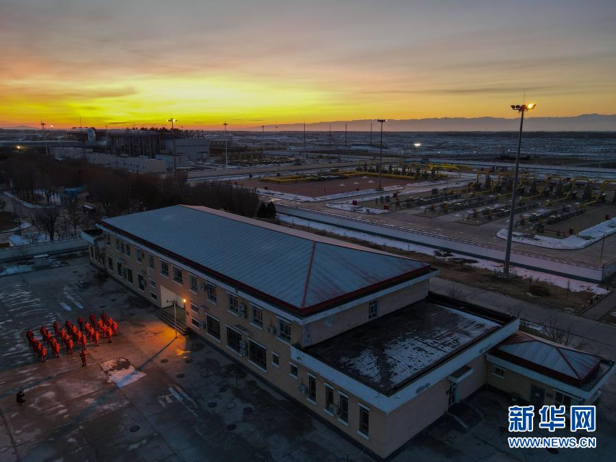 清晨的新疆霍尔果斯压气首站,赛依克江·吾龙和工友们在进行班前点名(2月4日摄,无人机照片)。新华社记者 高晗 摄
