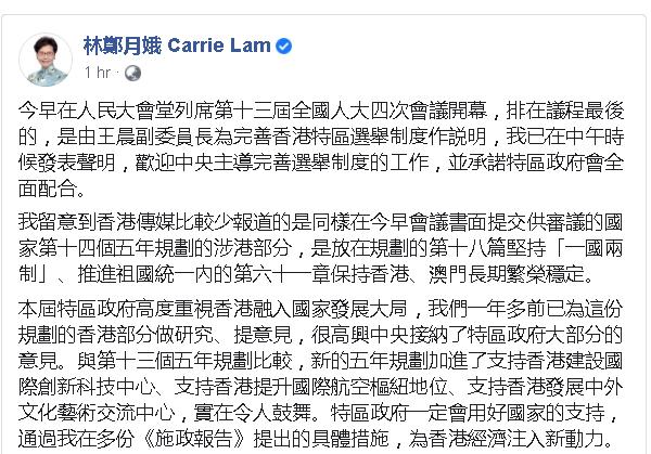 5日晚,香港特区行政长官林郑月娥在社交媒体发表文章称:今早(5日)在人民大会堂列席第十三届全国人大四次会议开幕,排在议程最后的,是由王晨副委员长为完善香港特区选举制度作说明,我已在中午时候发表声明,欢迎中央主导完善选举制度的工作,并承诺特区政府会全面配合。