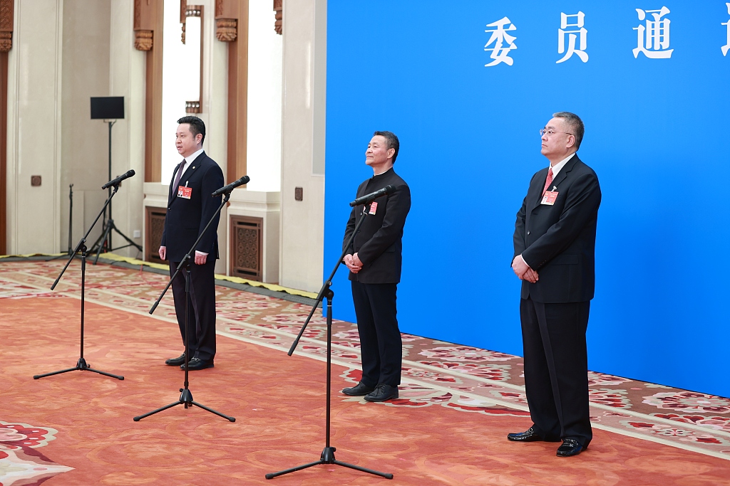 2021年3月7日上午,北京,全国政协十三届四次会议第二场“委员通道”采访活动在人民大会堂新闻发布厅举行,邀请部分全国政协委员通过网络视频方式接受媒体采访。全国政协委员周勇、斯泽夫、陈志列通过网络视频方式接受媒体采访。