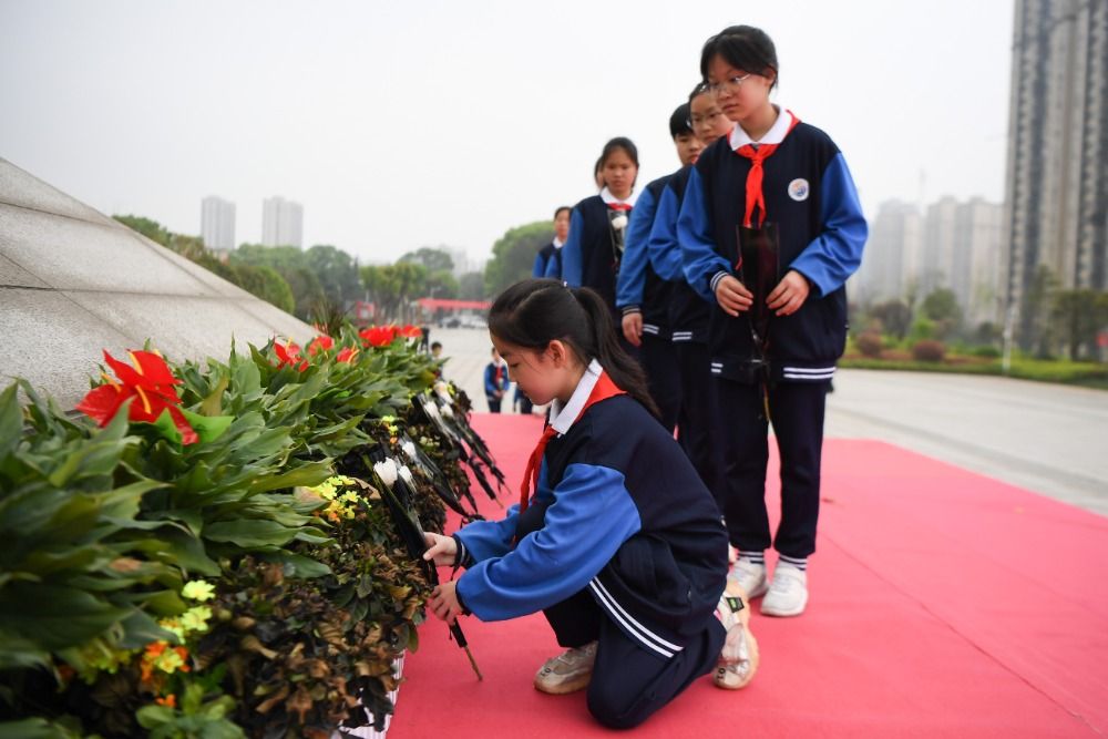 3月30日,长沙市长郡天心实验学校学生在湖南革命陵园烈士纪念碑前敬献鲜花。