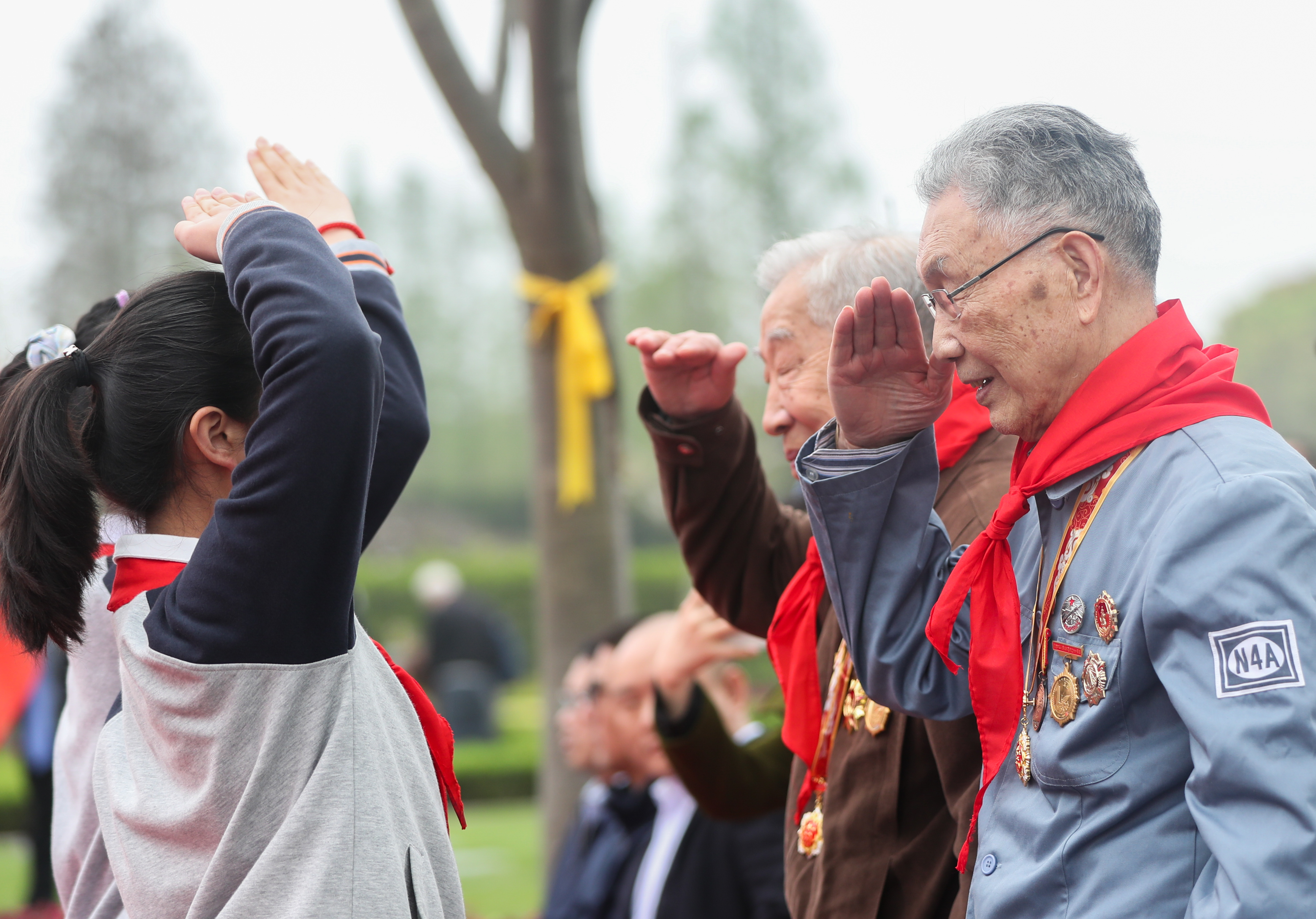4月2日,2021年上海市社会各界清明感恩典礼现场,少先队员向新四军老战士敬礼。新华社记者丁汀摄