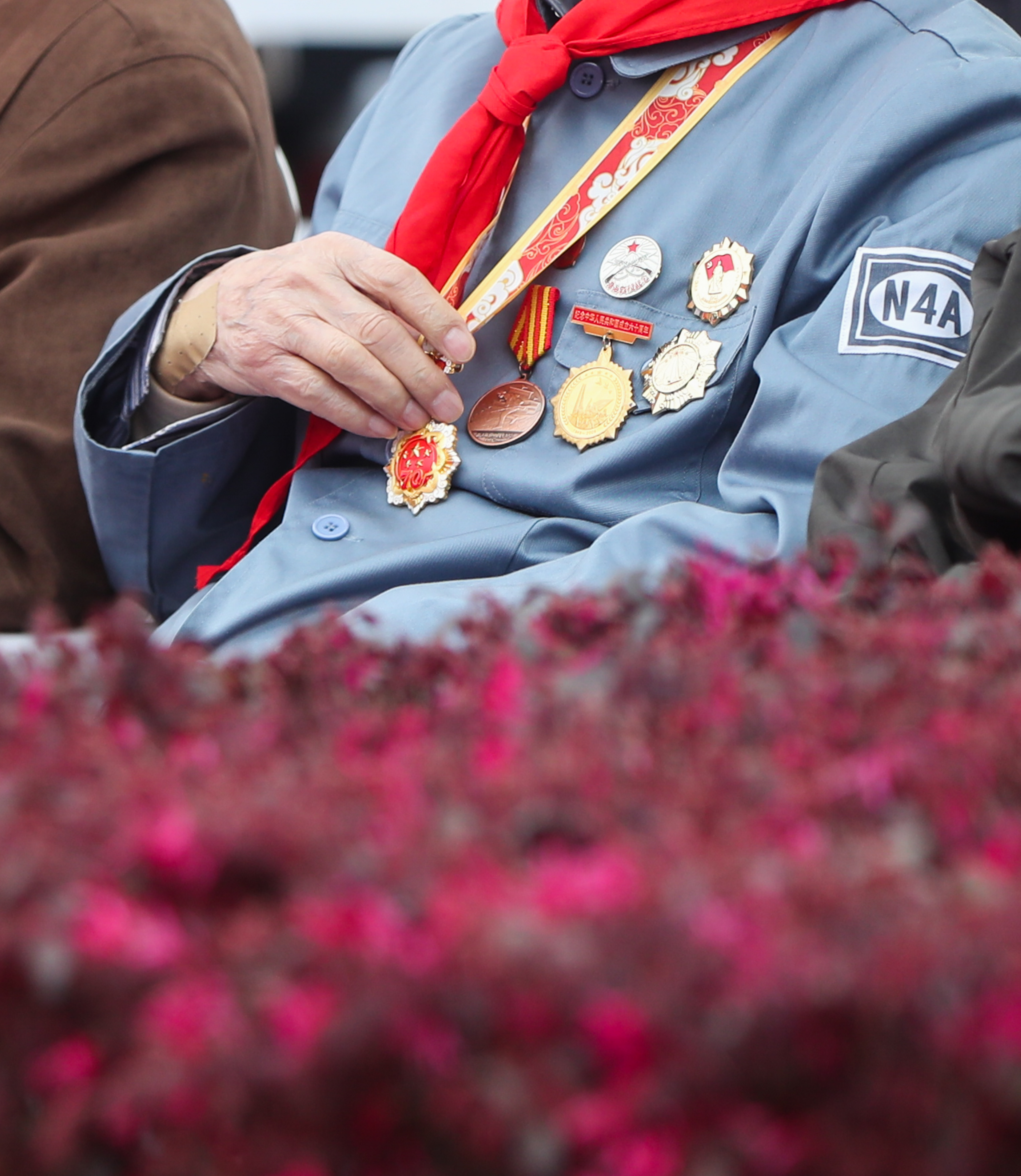 4月2日,2021年上海市社会各界清明感恩典礼现场,出席活动的新四军老战士冯国樑整理胸前的勋章。新华社记者丁汀摄