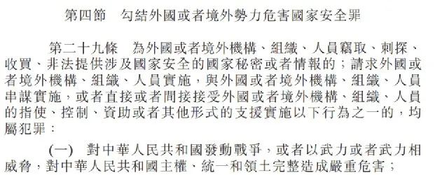 他们涉嫌违反香港国安法第29条,犯“勾结外国或境外势力危害国家安全罪”。