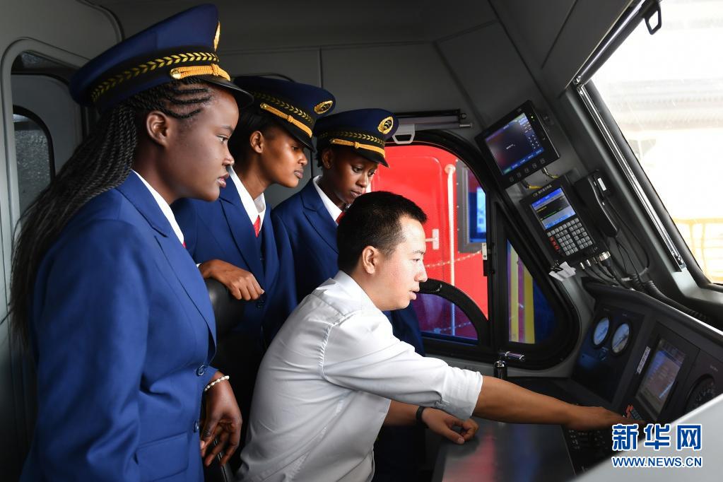 在肯尼亚内罗毕,肯尼亚火车司机跟随中国老师张程熟悉操作流程(2017年5月17日摄)。新华社记者 孙瑞博 摄