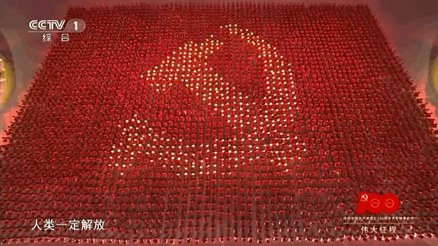 演出临近尾声,16米高金色党徽悬挂鸟巢上空,全场高唱《没有共产党就没有新中国》。