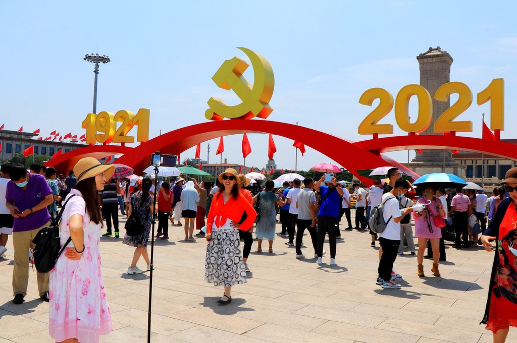 2021年7月2日,北京。今天是建党百年庆祝大会天安门广场景观向公众开放参观的首日,从早上8时开始,前往广场参观的游客络绎不绝。