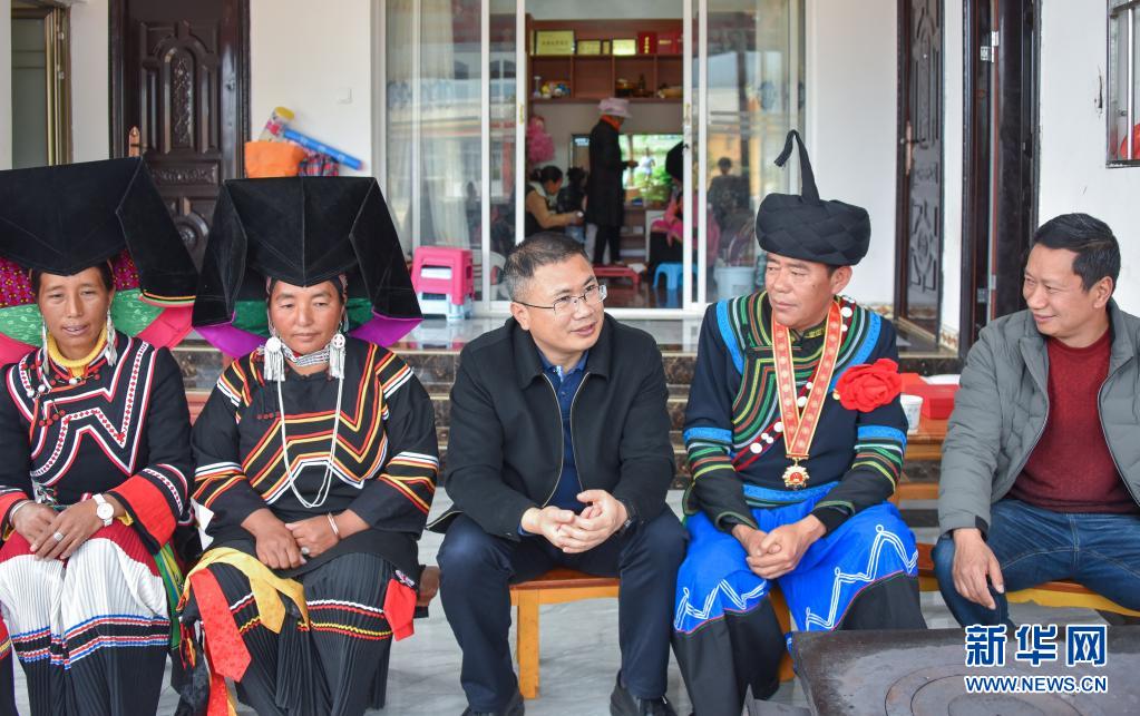 聂金辉(中)在老君山镇新和村易地扶贫搬迁安置点索玛小镇看望慰问彝族群众(3月3日摄)。新华社发(剑川县融媒体中心供图)