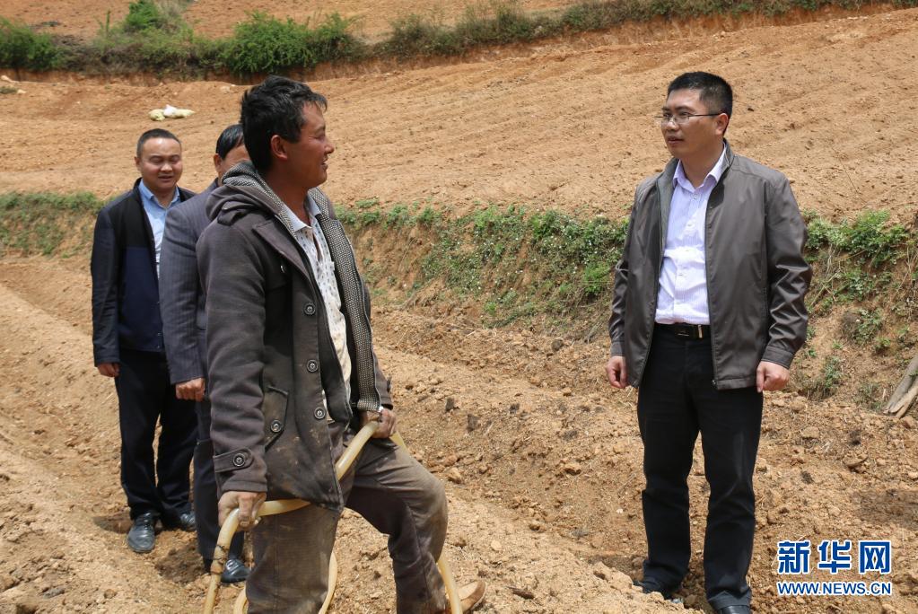 聂金辉(右一)在剑川县弥沙乡调研时和当地群众交流(2016年4月28日摄)。新华社发(剑川县融媒体中心供图)