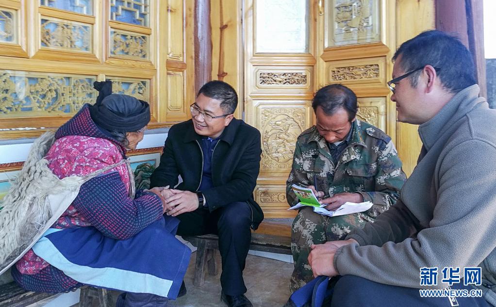 聂金辉(左二)在剑川县羊岑乡金坪村走访建档立卡贫困户(2018年11月20日摄)。新华社发(剑川县融媒体中心供图)