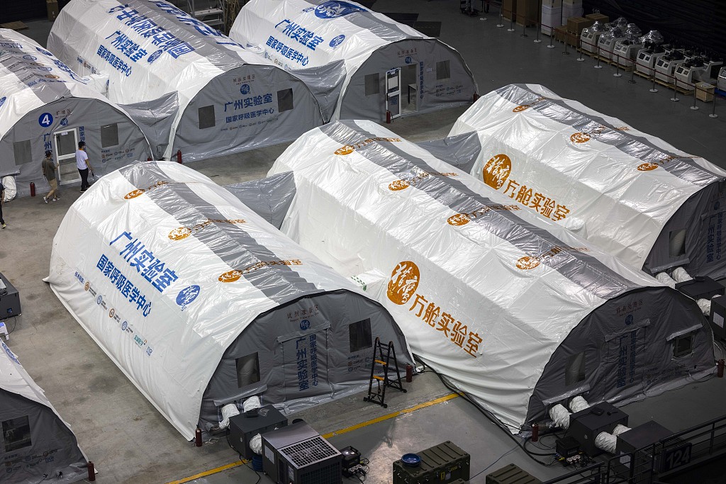 2021年7月27日,在南京青奥体育公园体育馆投入使用的“猎鹰号”气膜实验室。实验室用于对南京全市核酸样本进行24小时全天候的收样检测。馆内6组共18座气膜实验室,可帮助南京市一天内完成180万人份的核酸检测。
