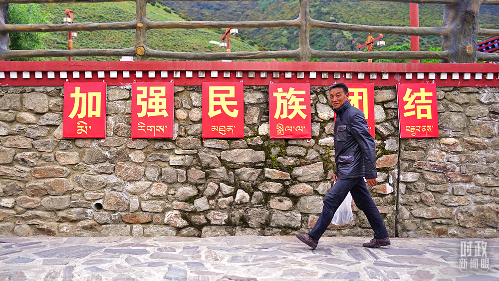 △西藏林芝嘎拉村村民走过“加强民族团结”标语墙。(总台国广记者李晋拍摄)
